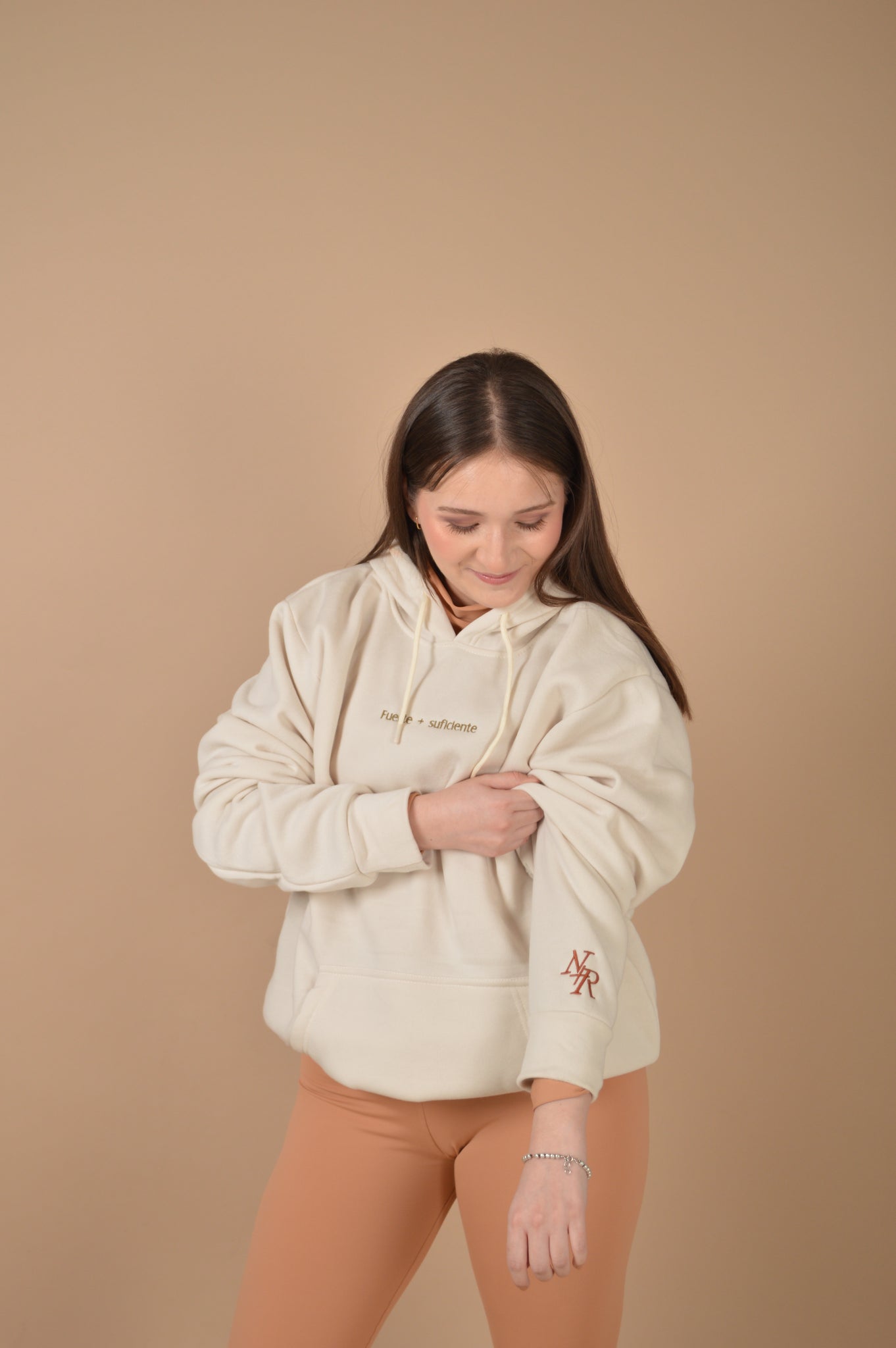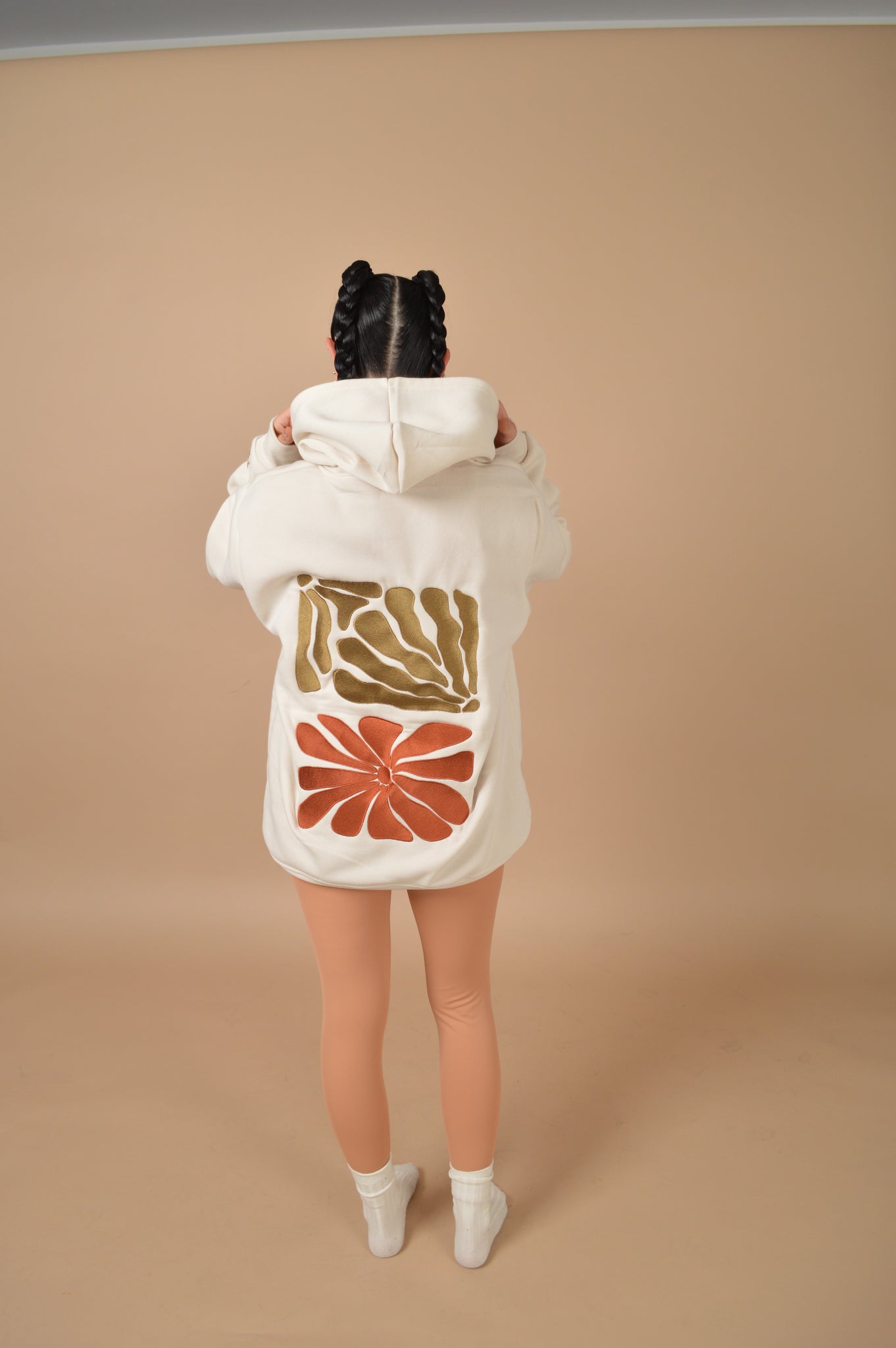 Atrás bordado de flores abstractas en colores ocre y beige.